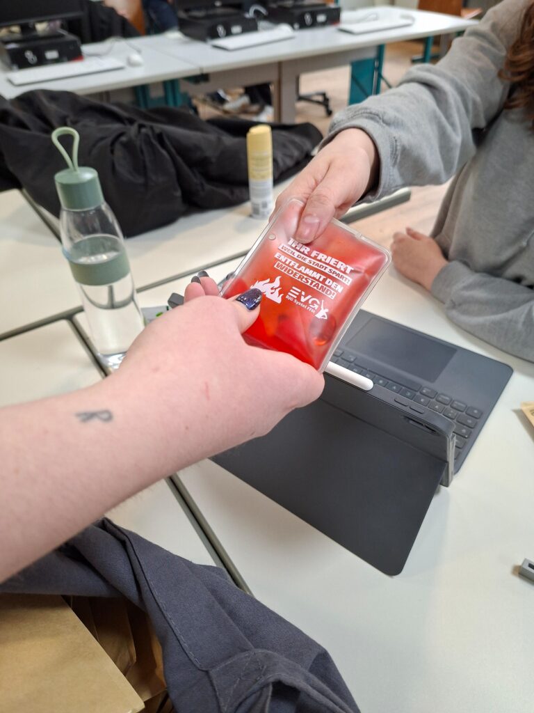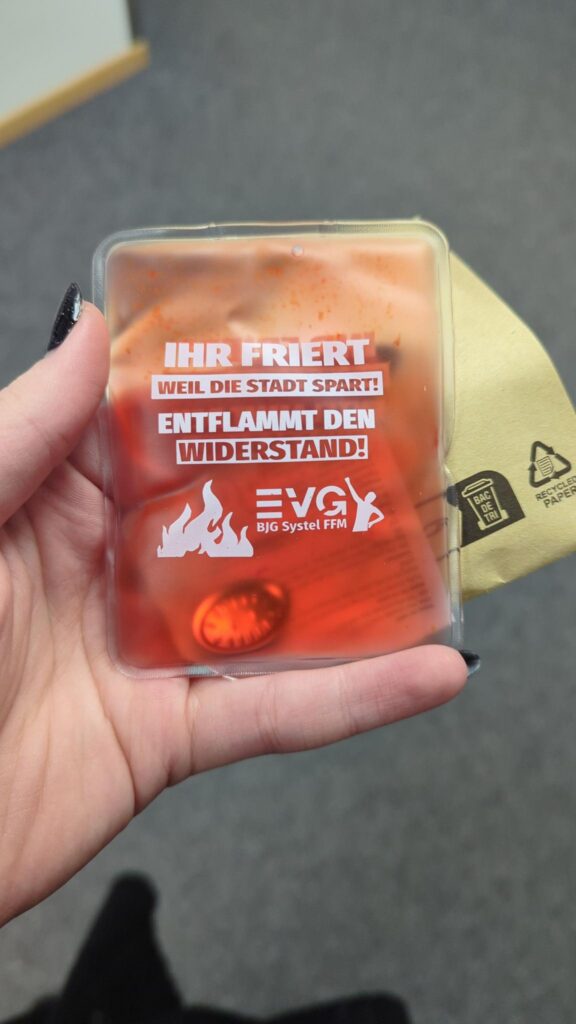 Artikel in der „Frankfurter Rundschau“ über eine Aktion der EVG Betriebsjugendgruppe DB Systel Frankfurt. Wegen ständig defekter Heizungen wurden dort Hand-Wärmekissen mit entsprechendem Aufdruck verteilt: