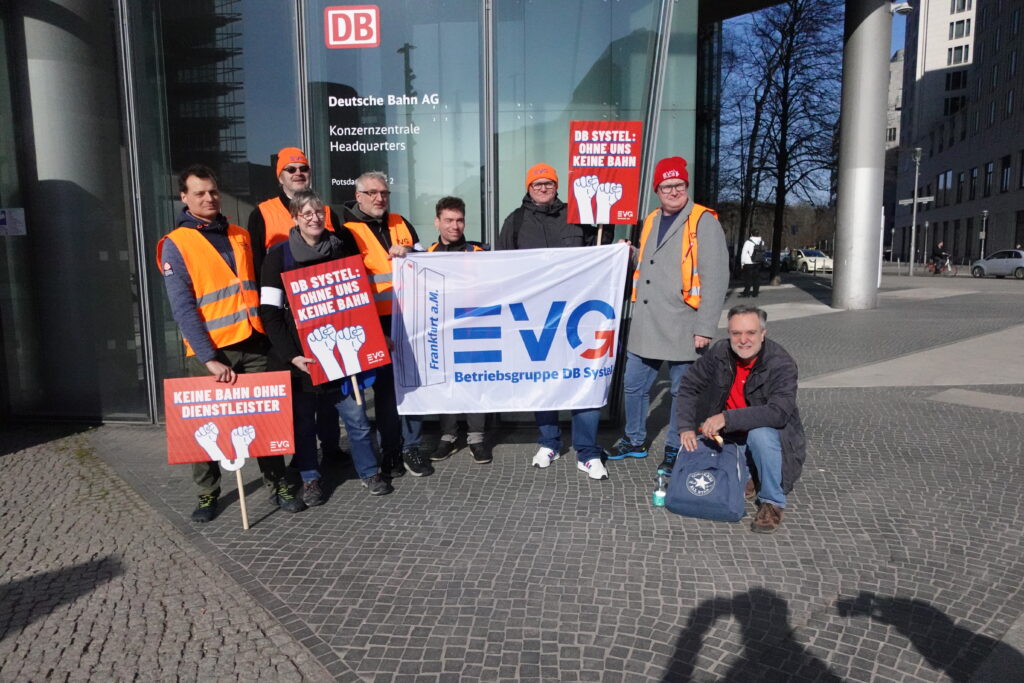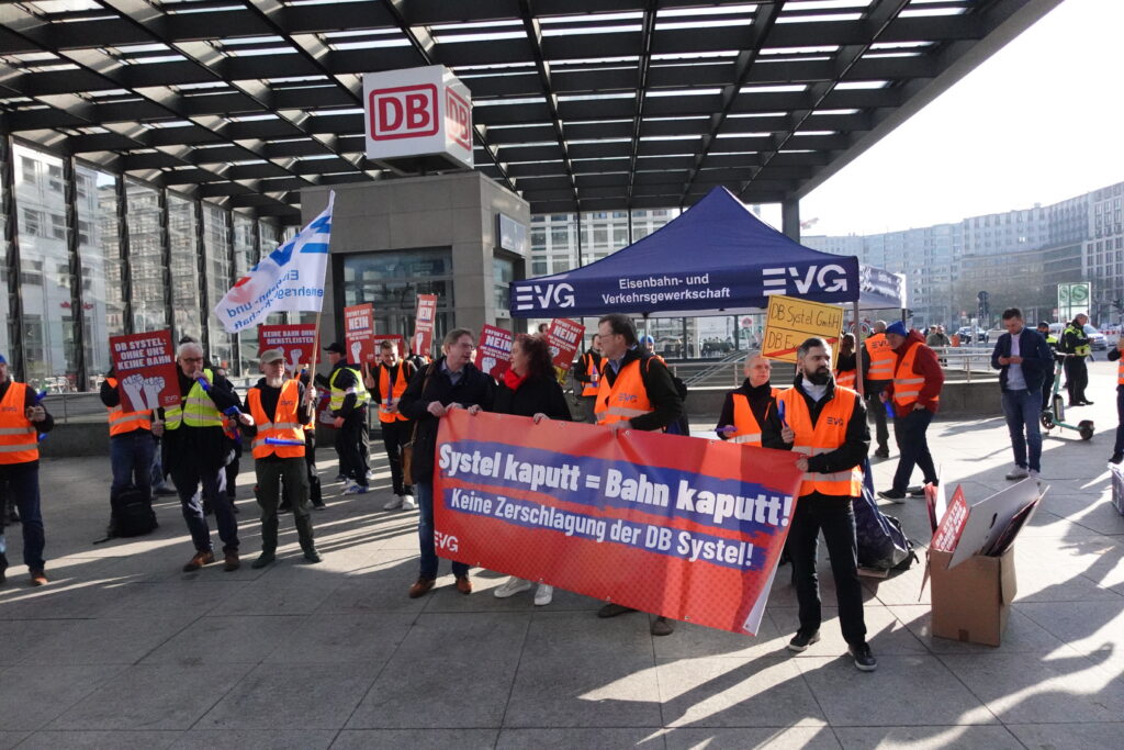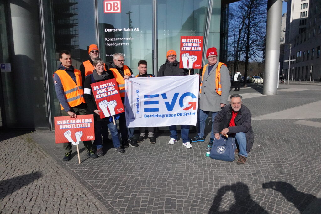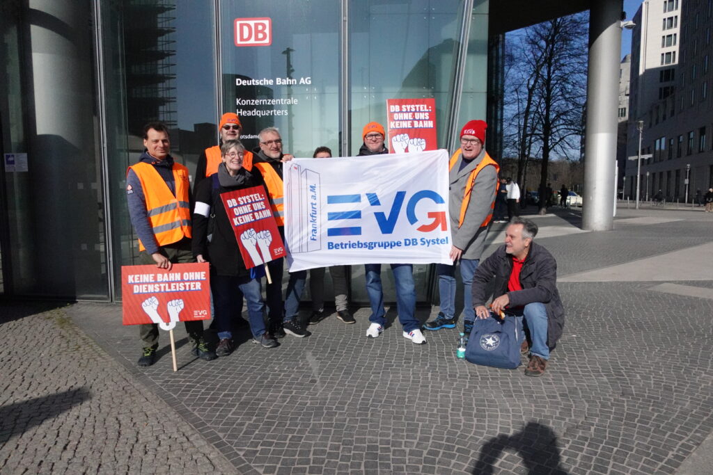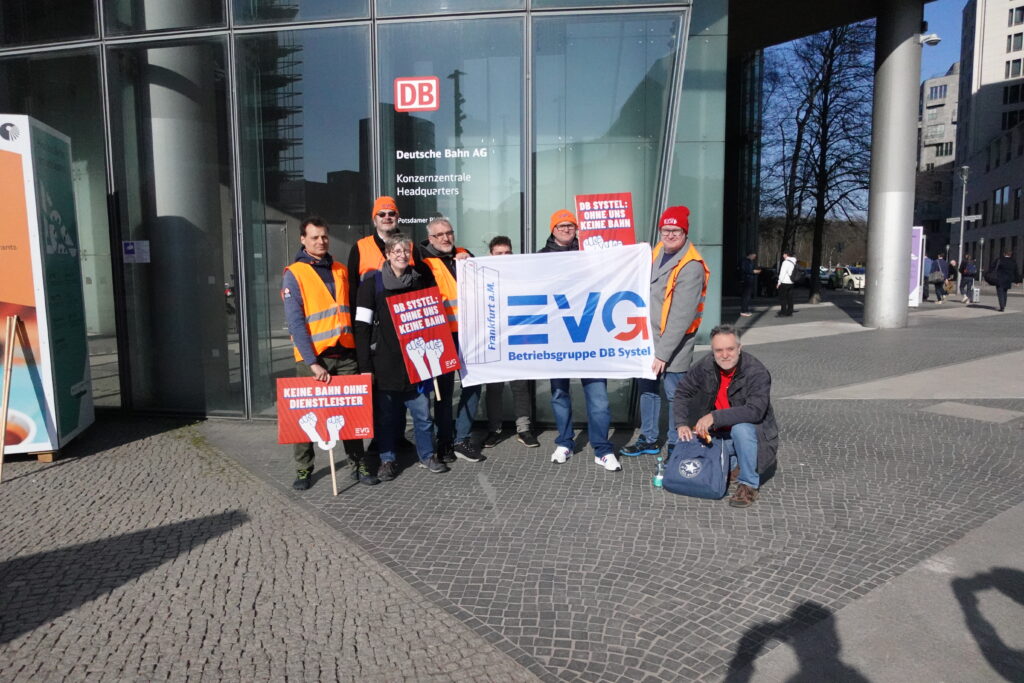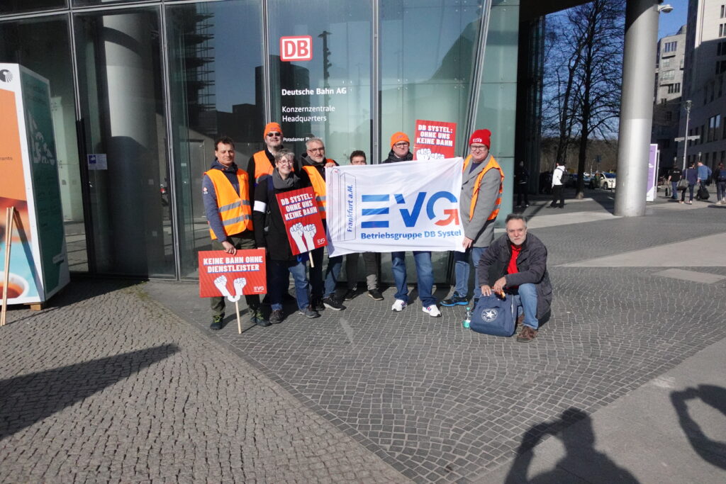 Heute, am 11.03.2026, haben wir uns in Berlin vor dem DB-Tower versammelt – aufgerufen von den DB Systel Betriebsgruppen Berlin, Erfurt und Frankfurt – um unseren Verhandlern von EVG und GBR Power mitzugeben und der Konzernleitung unseren Unmut über die Pläne zur Zerschlagung der Systel zu verdeutlichen. Vielen Dank an alle, die vor Ort waren oder im Hintergrund an der Organisation mitgewirkt haben!