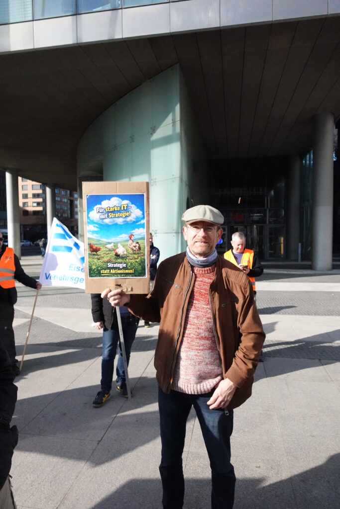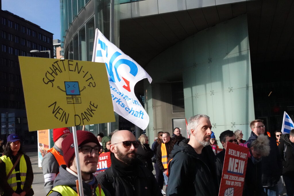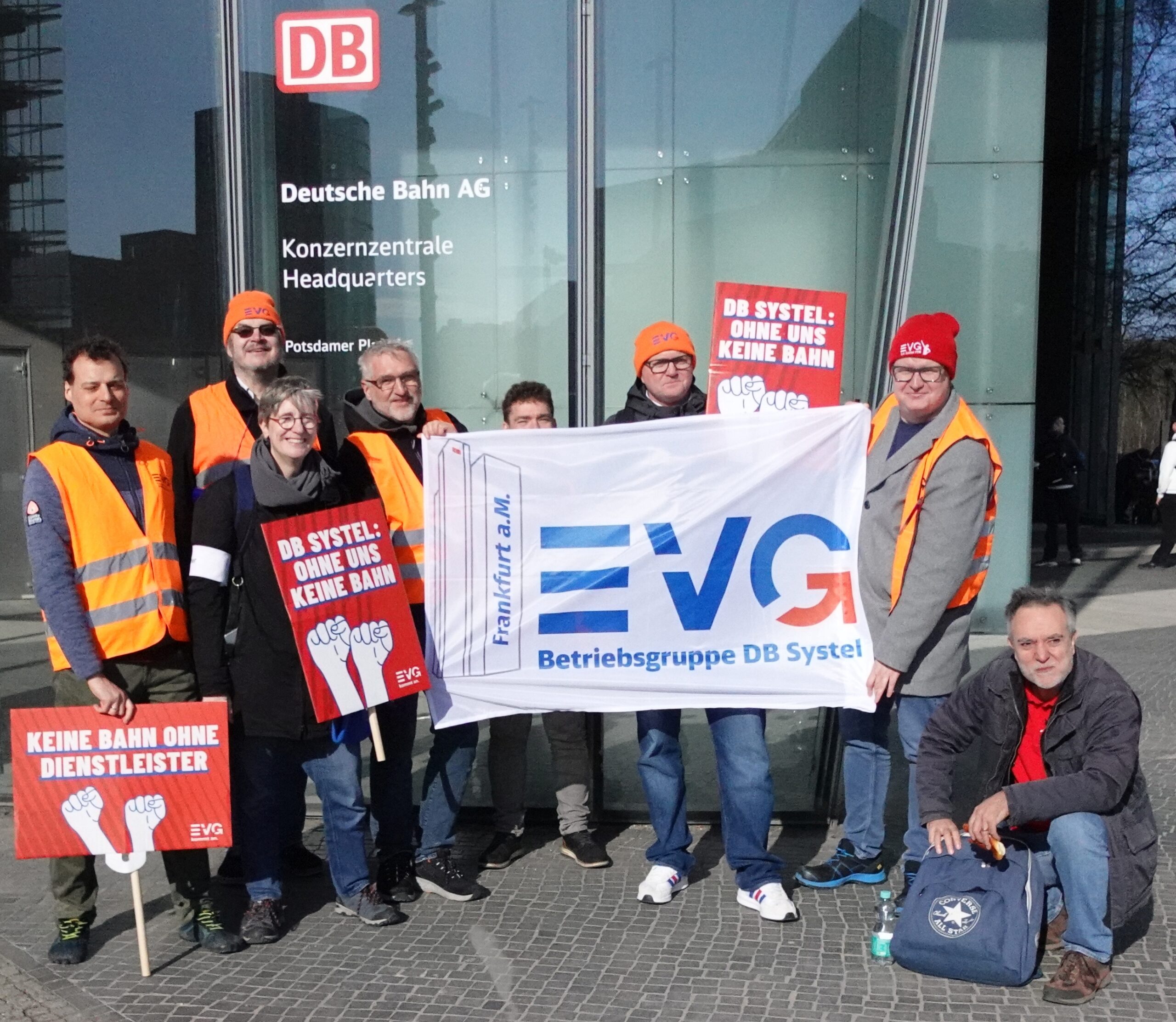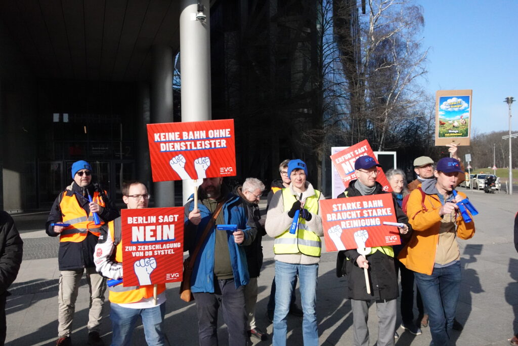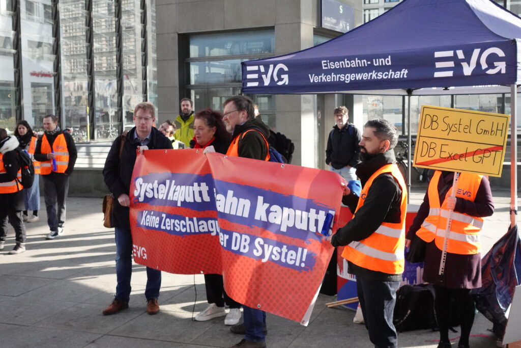 Heute, am 11.03.2026, haben wir uns in Berlin vor dem DB-Tower versammelt – aufgerufen von den DB Systel Betriebsgruppen Berlin, Erfurt und Frankfurt – um unseren Verhandlern von EVG und GBR Power mitzugeben und der Konzernleitung unseren Unmut über die Pläne zur Zerschlagung der Systel zu verdeutlichen. Vielen Dank an alle, die vor Ort waren oder im Hintergrund an der Organisation mitgewirkt haben!